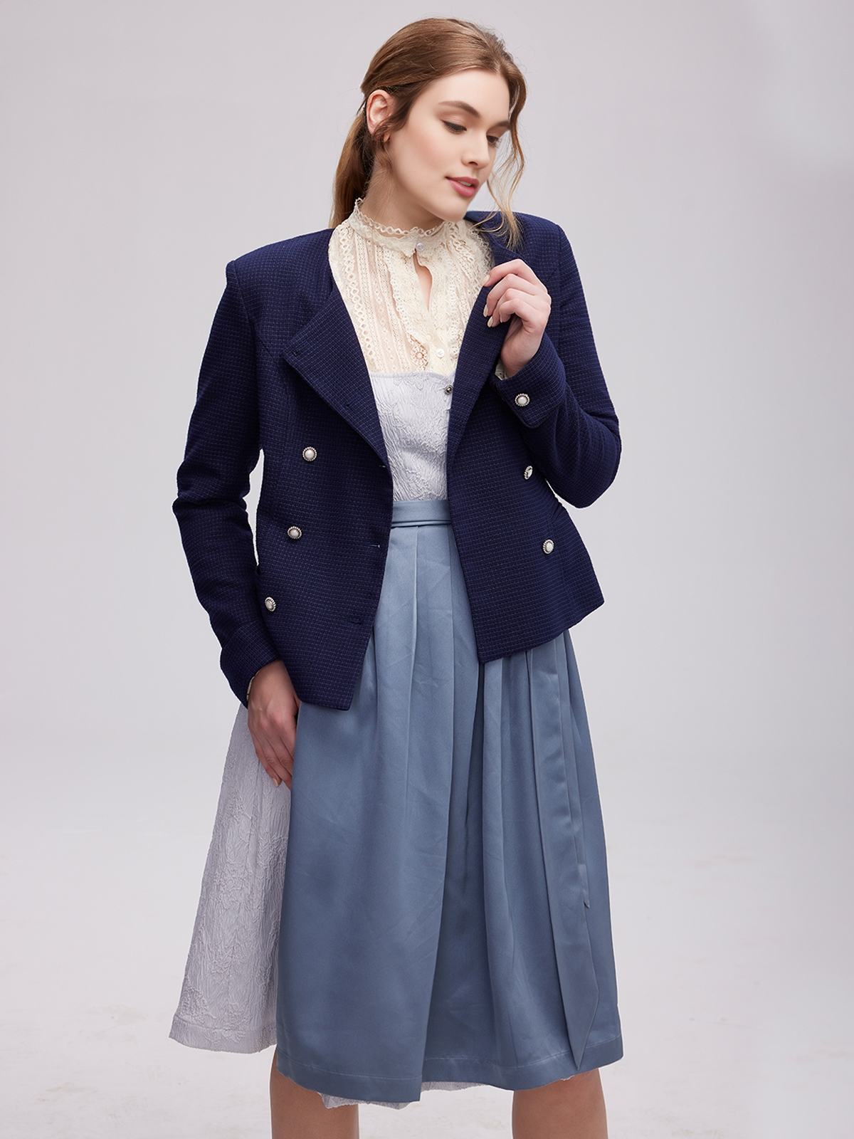 - Ein tailliertes Dirndl in dunklem Lila mit einer Blazer-Kombi wirkt seriös und feminin.